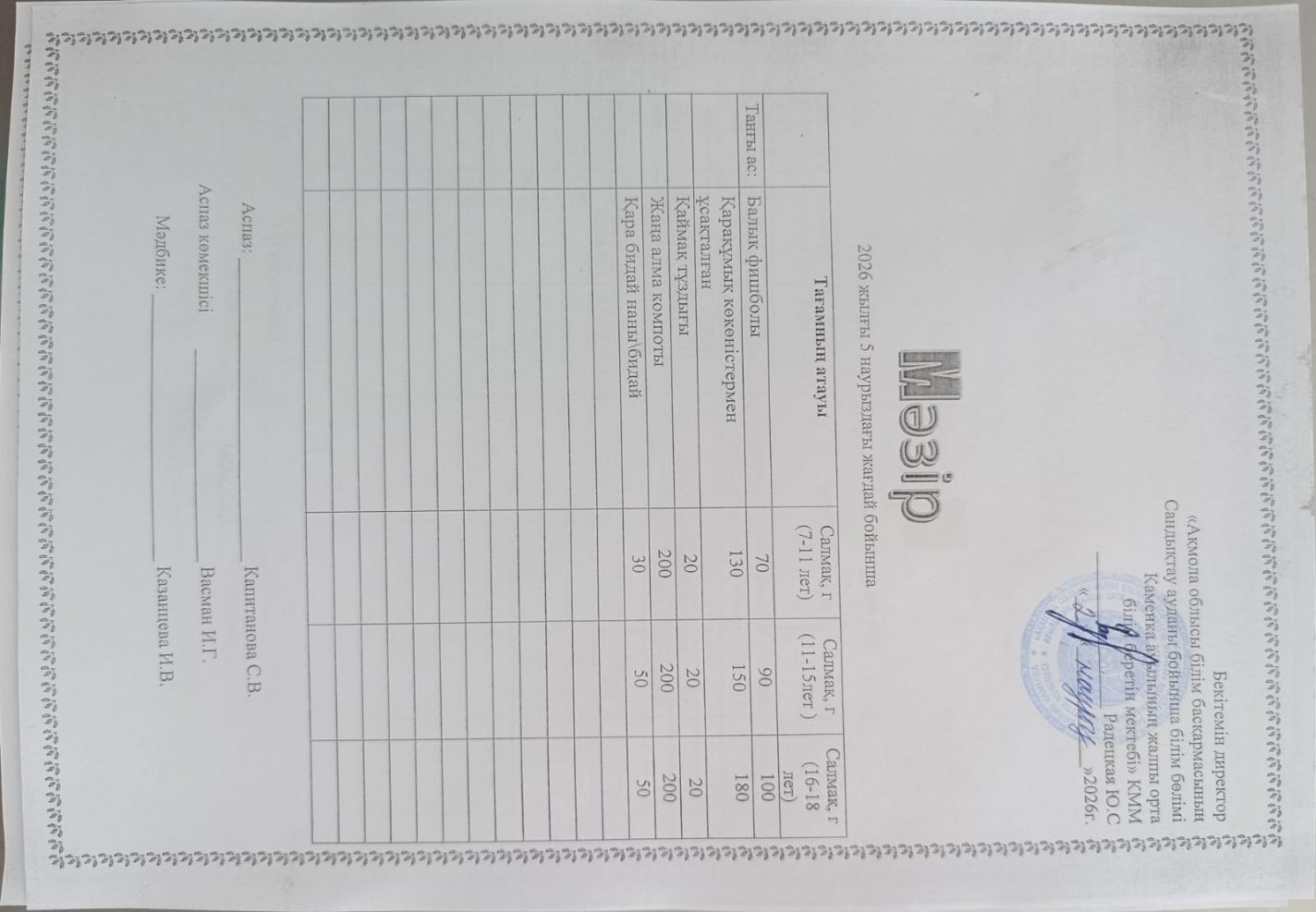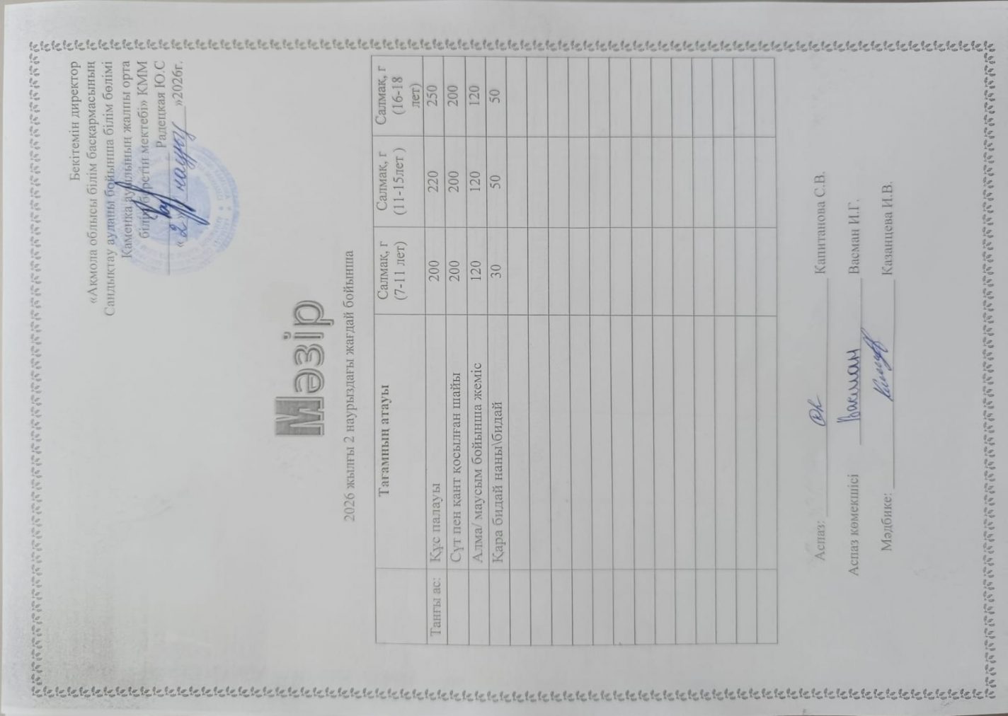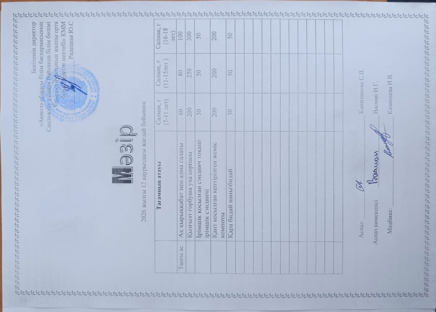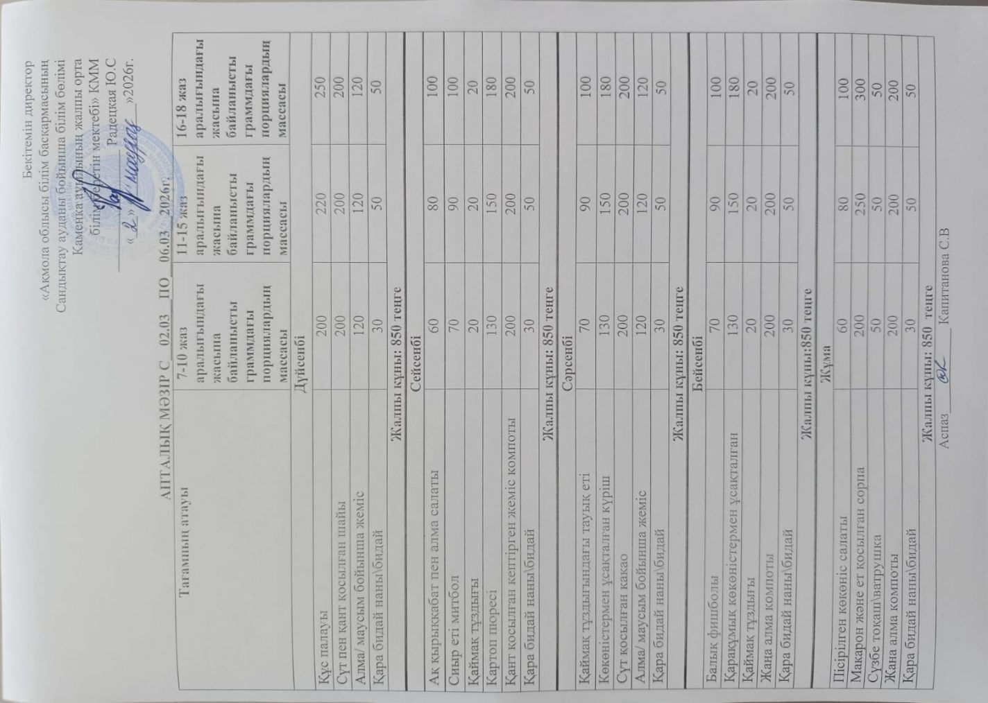 Апталық мәзір 2025-2026 оқу жылы