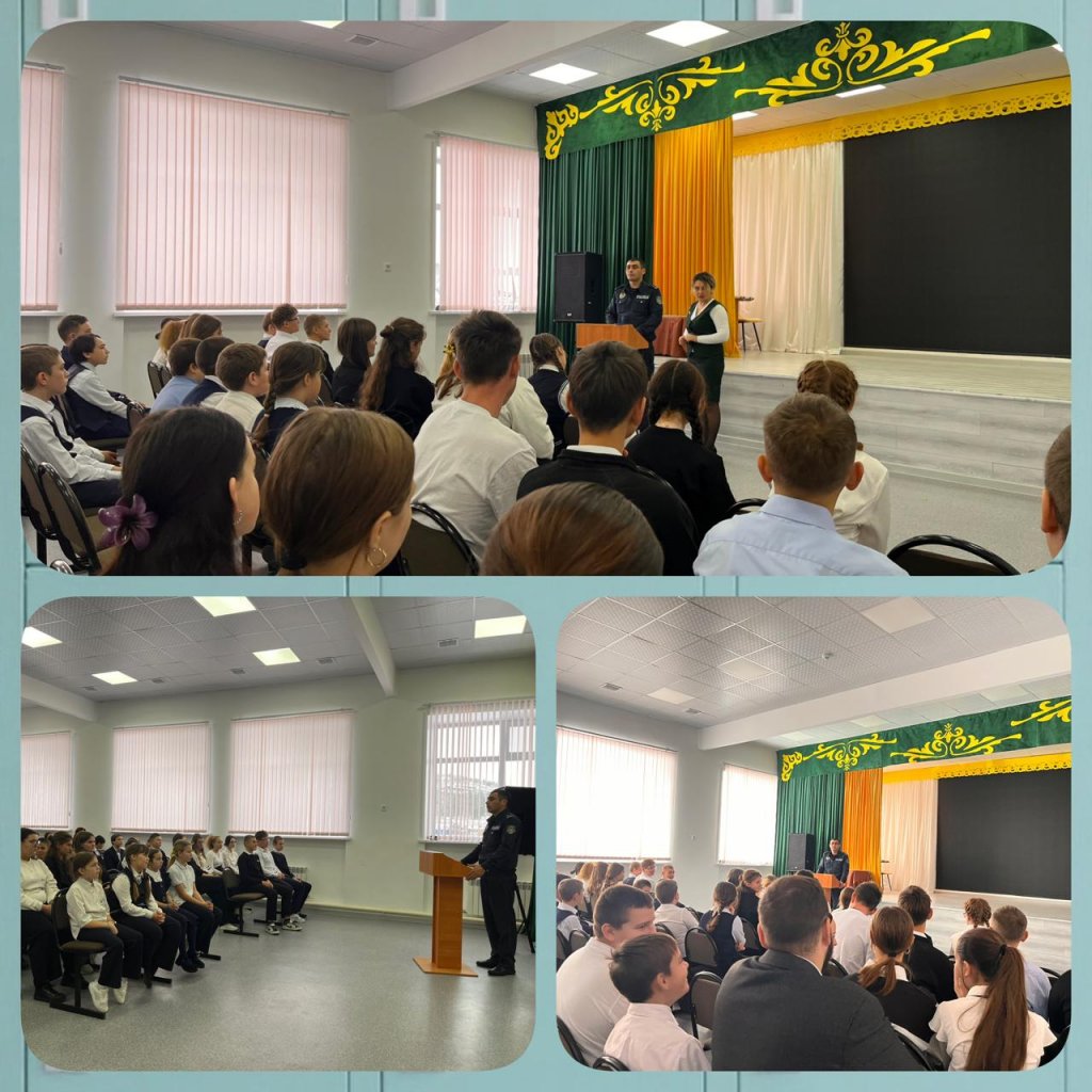Біздің мектепте 5–11 сынып оқушыларымен құқықбұзушылық, буллинг және интернет-алаяқтық мәселелері бойынша профилактикалық әңгіме өткізілді. Кездесуді полиция капитаны Айсин М.М. мектеп директоры Радецкая Ю.С. бірге жүргізді. Оқушыларға жауапкершілік, қауіпсіз мінез-құлық және бір-біріне құрмет көрсету туралы еске салынды.