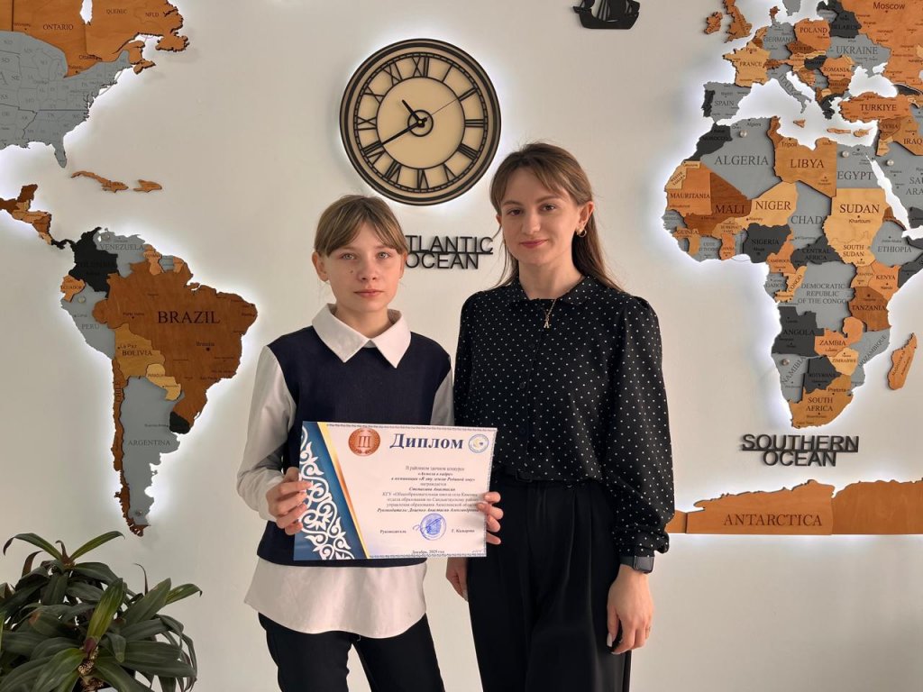 7-сынып оқушысы Степахина Анастасия аудандық заочтық «Ақмола кадрда» байқауына қатысып, «Мен осы жерді туған жерім деп атаймын» номинациясында III орынға ие болды. Жетекшісі — Доценко Анастасия Александровна. Анастасияны лайықты жетістігімен құттықтап, алдағы уақытта шығармашылық табыс пен жаңа жетістіктер тілейміз!