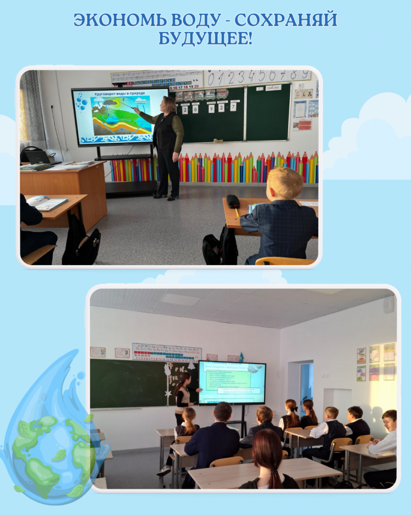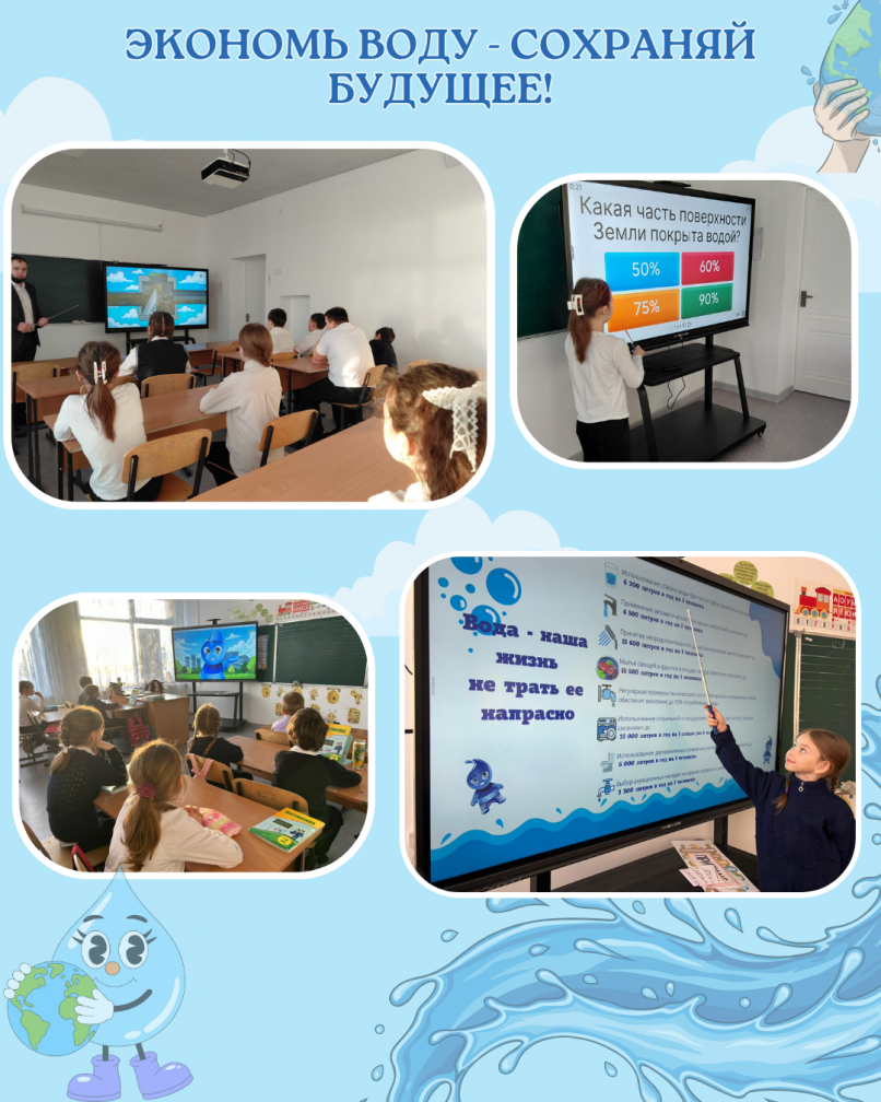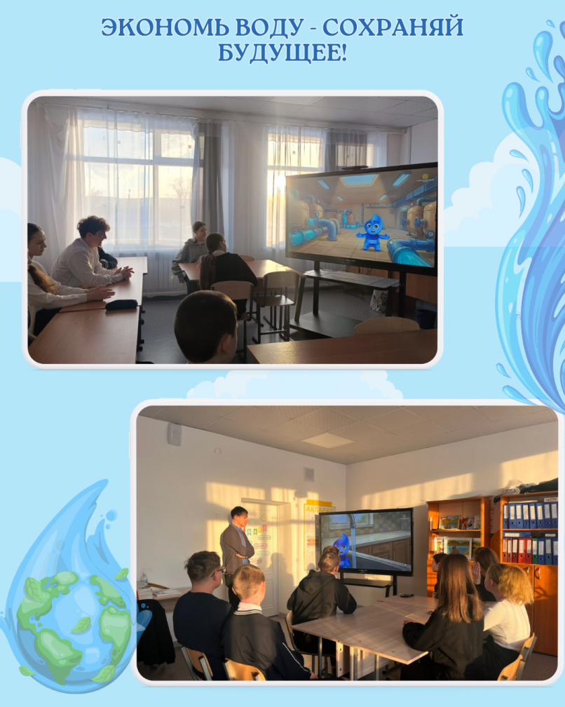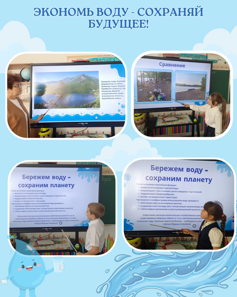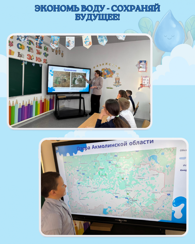 Экологиялық сағаттар барысында оқушылар танымдық бейнеролик көріп, судың адам өмірі, табиғат және барлық тіршілік иелері үшін маңызы, сондай-ақ су ресурстарына немқұрайлы қараудың салдары туралы мағлұмат алды. Көрсетілімнен кейін оқушылар көргендерін талқылап, өз ойларымен бөлісіп, сұрақтарға белсенді жауап берді.