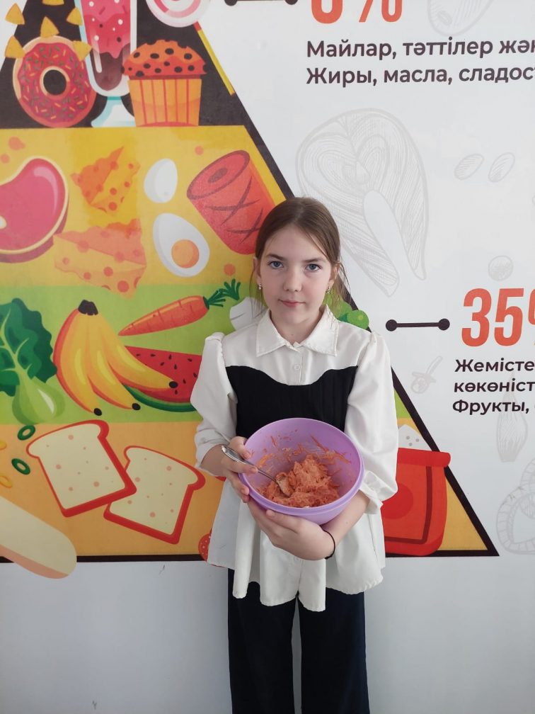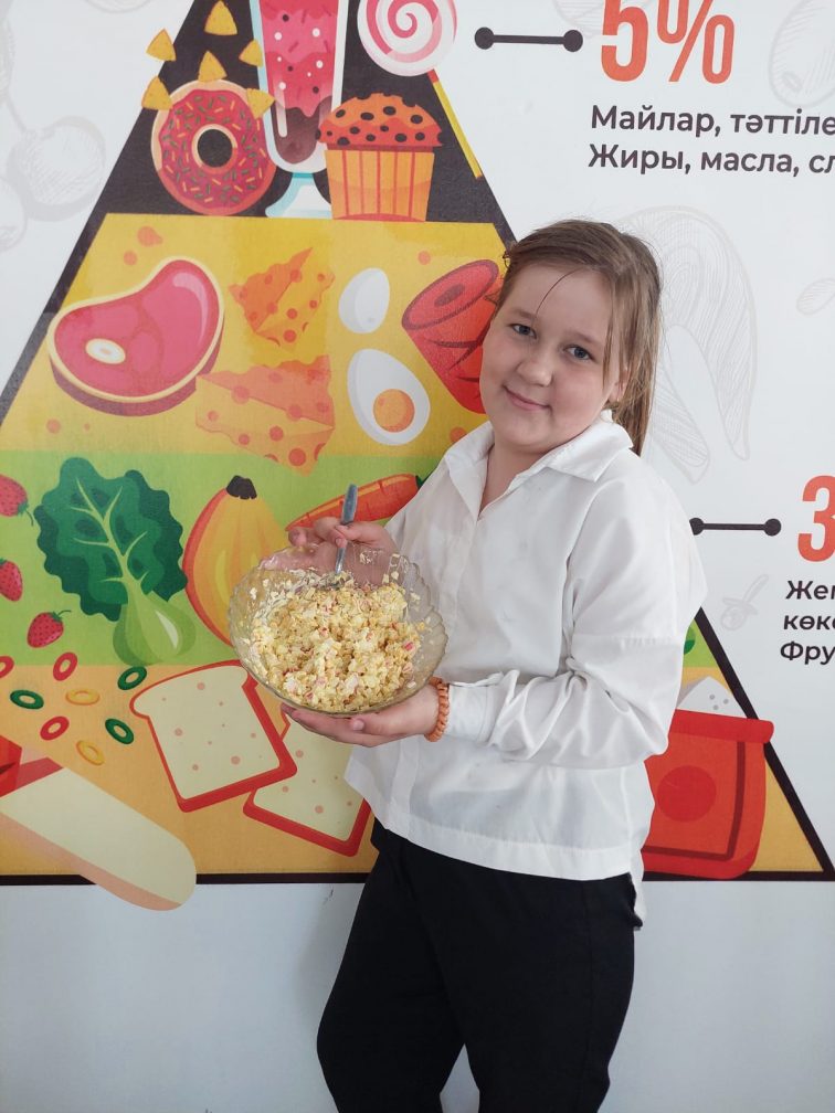Сабақтың тәжірибелік бөлімі өте қызықты өтті: оқушылар қарапайым әрі пайдалы салаттарды өздері дайындап, оларды безендіруде шығармашылық қабілеттерін көрсетті.