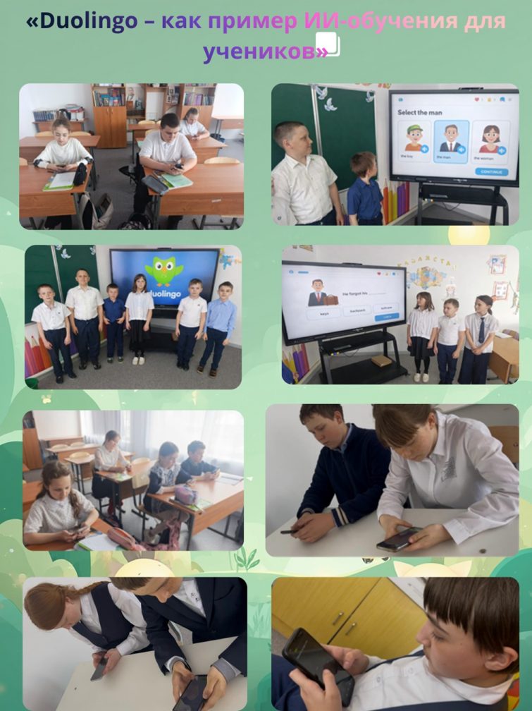 16 сәуір ағылшын тілі Онкүндігі аясында бастауыш сынып оқушылары Duolingo танымал қосымшасының интерфейсімен танысты. Оқушылар платформаның негізгі мүмкіндіктерін ынтамен зерттеп, оны ағылшын тілін үйрену үшін белсенді түрде пайдалануға дайын екендіктерін білдірді. Жоғары жастағы оқушылар тапсырмаларды ынтамен орындап, ұпай жинап, өзара жарысты. Бұл формат жоғары қызығушылық пен мотивация туғызып, оқу үдерісін қызықты әрі заманауи ете түсті. «Duolingo- оқушыларға арналған ЖИ көмегімен оқытудың мысалы»