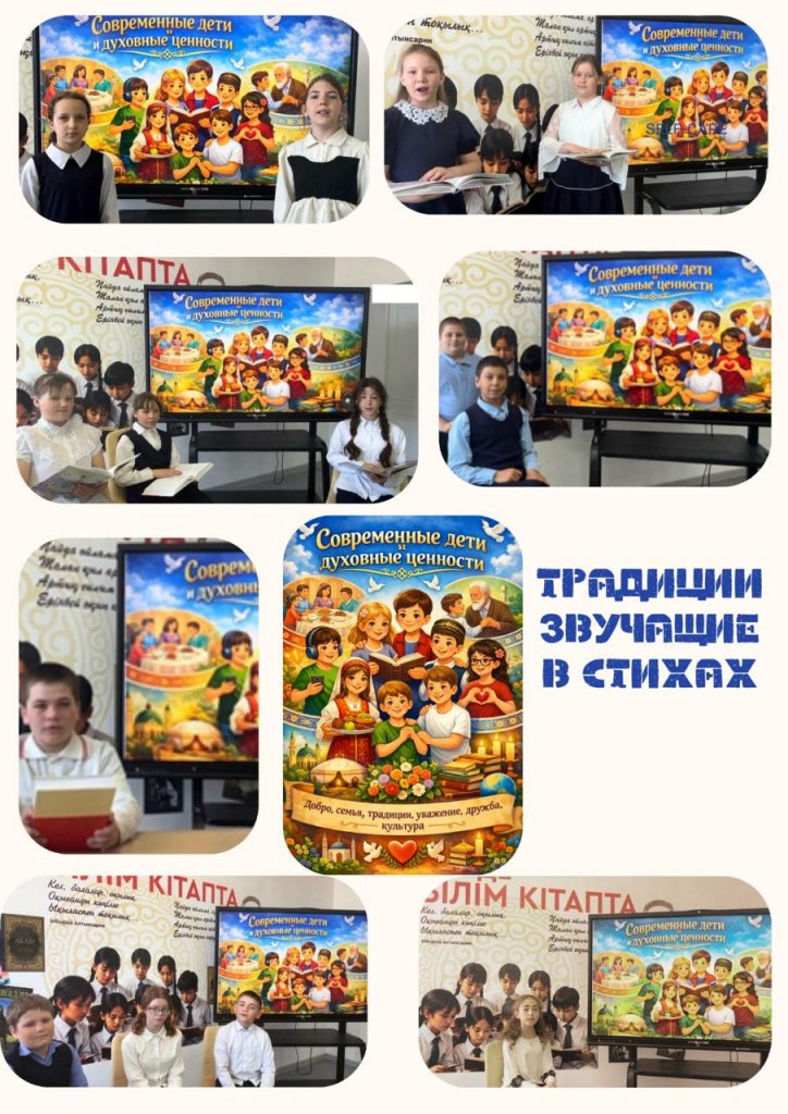 «Балалар әдебиеті- рухани тәрбие көзі» Онкүндігі аясында 5-6-сынып оқушылары жас ұрпақ бойында адамгершілік құндылықтарды дамытудың маңызды мәселелеріне арналған тақырыптық күн өткізілді. Шара екі негізгі тақырыпты біріктірді: «Заманауи балалар және рухани құндылықтар» және «Поэзияда ашылған дәстүрлер». «Поэзияда ашылған дәстүр» тақырыбы аясында оқушыларға мәдени дәстүрді, отбасылық құндылықтарды, туған жерге деген сүйіспеншілікті бейнелейтін ақындардың шығармалары ұсынылды. Оқушылар өлеңдерін мәнерлеп айтып, мазмұнын талдап, алған әсерлерімен бөлісті.